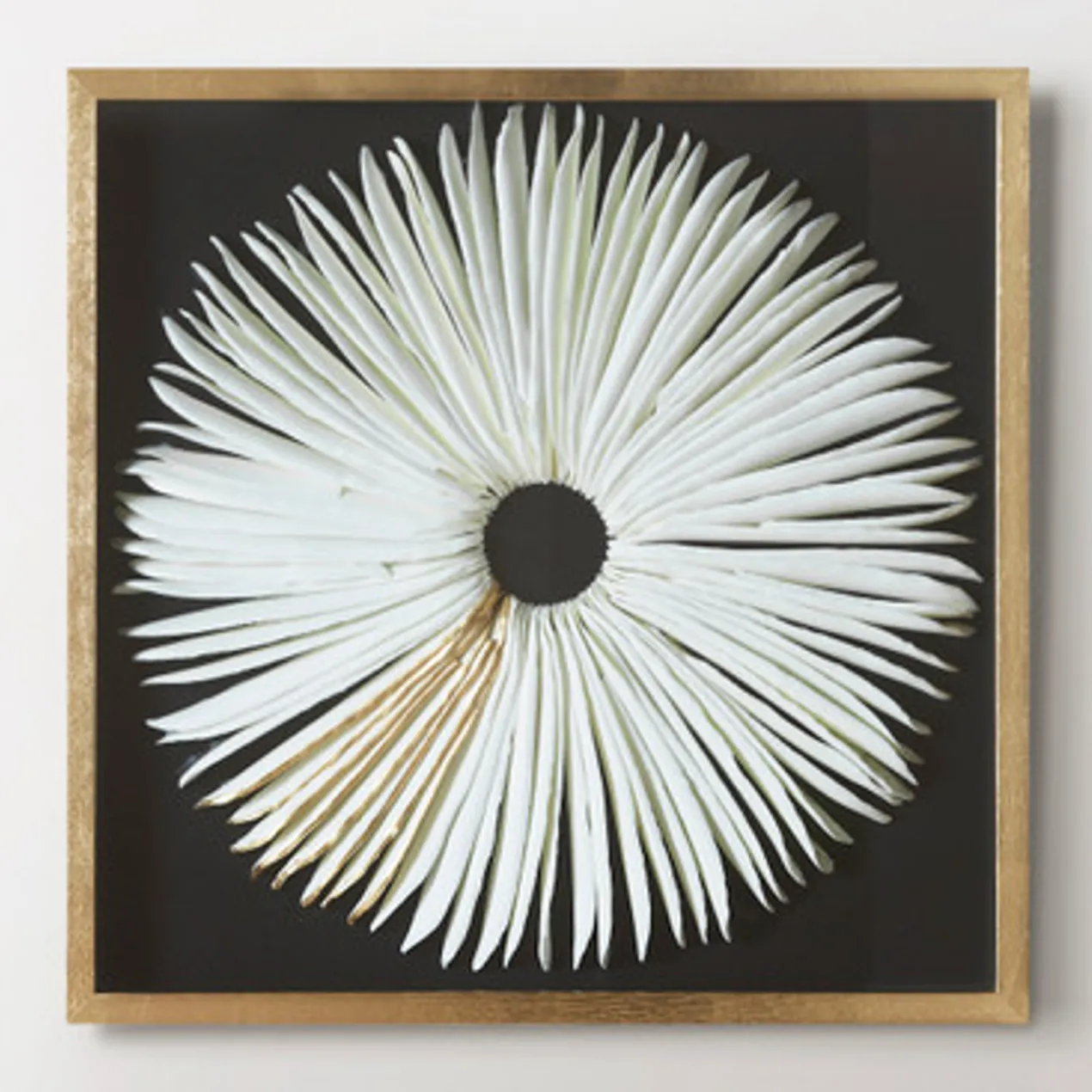 Featuring hand-sculpted clay arranged in a circular pattern with gilded accents, this dimensional work adds an incredible element of texture and shine to the wall. Displayed under glass in a gold shadowbox frame.