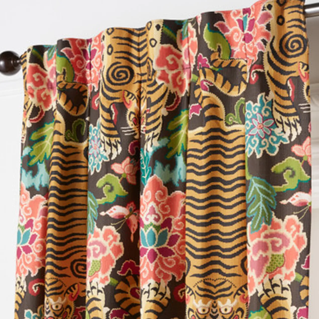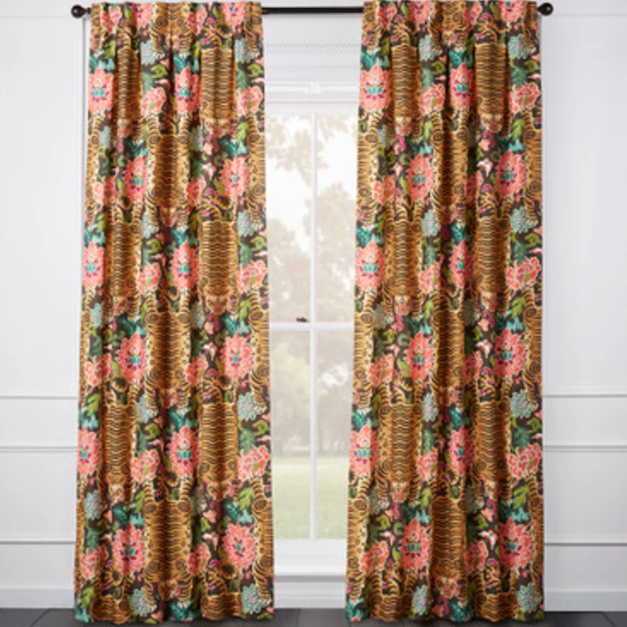 Crafted of cotton with a lively tiger print, our Nimer Panel enriches any interior with bold pattern and a touch of whimsy. Customizable to fit your space, it’s offered in four lengths (84”, 96”, 108”, or 120”), two header styles (rod pocket or inverted pleat), and two colorways (gold or grey). Panel includes lining. Sold as a single panel.