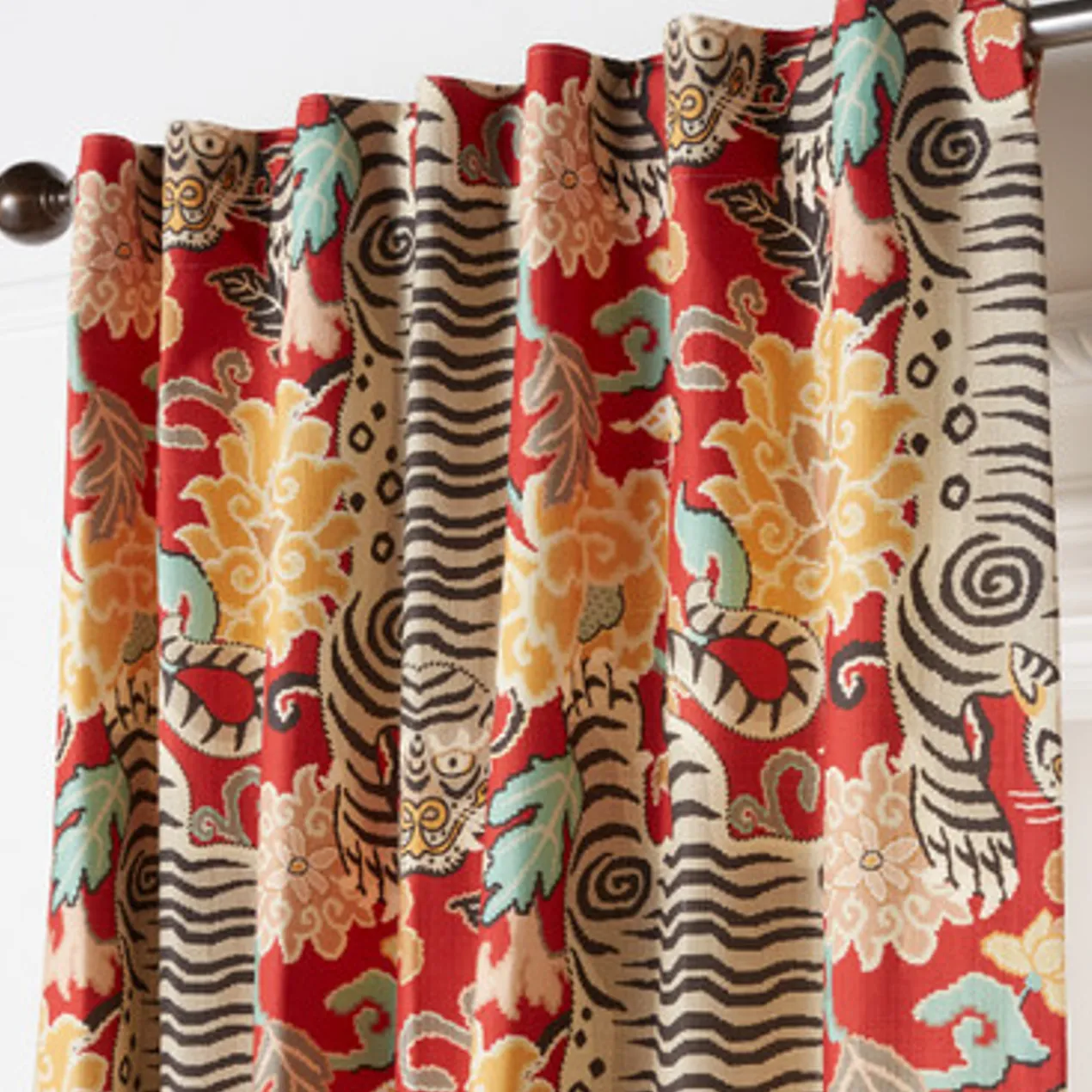 Crafted of cotton with a lively tiger print, our Nimer Panel enriches any interior with bold pattern and a touch of whimsy. Customizable to fit your space, it’s offered in four lengths (84”, 96”, 108”, or 120”), two header styles (rod pocket or inverted pleat), and two colorways (gold or grey). Panel includes lining. Sold as a single panel.