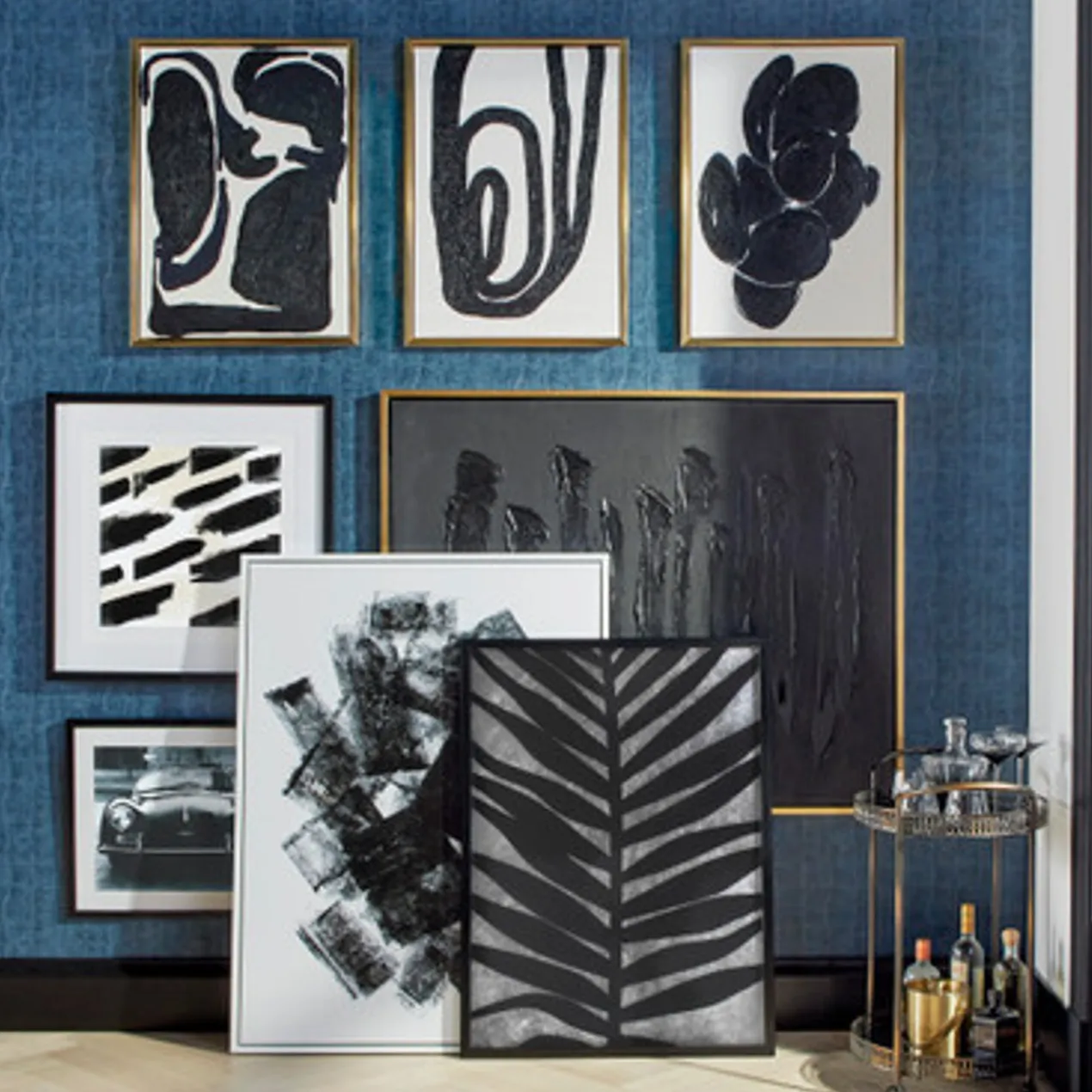 Bold brushstrokes in a moody, dark palette add an incredible element of texture and drama to this abstraction. Painted on canvas, this piece is displayed in a gold floater frame.