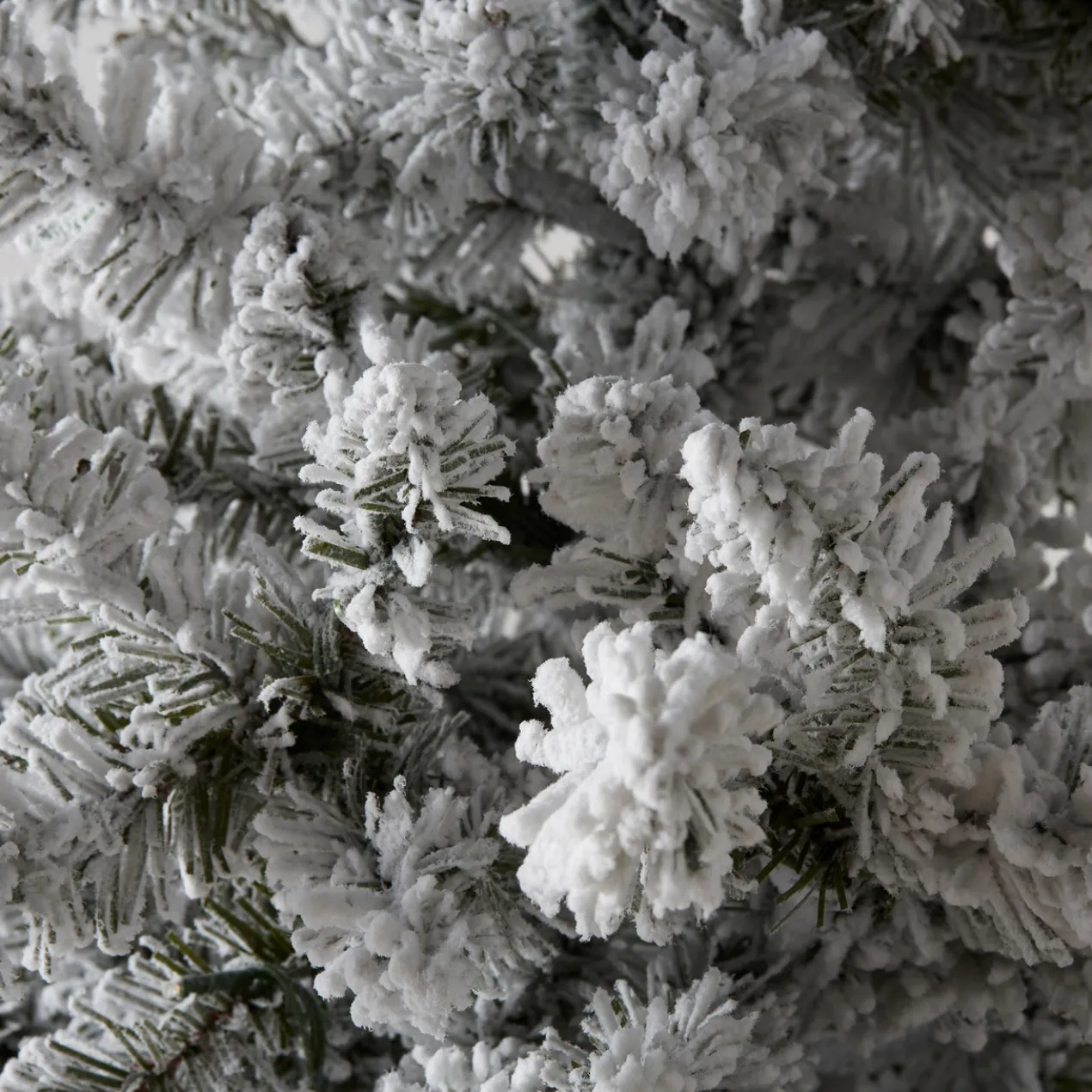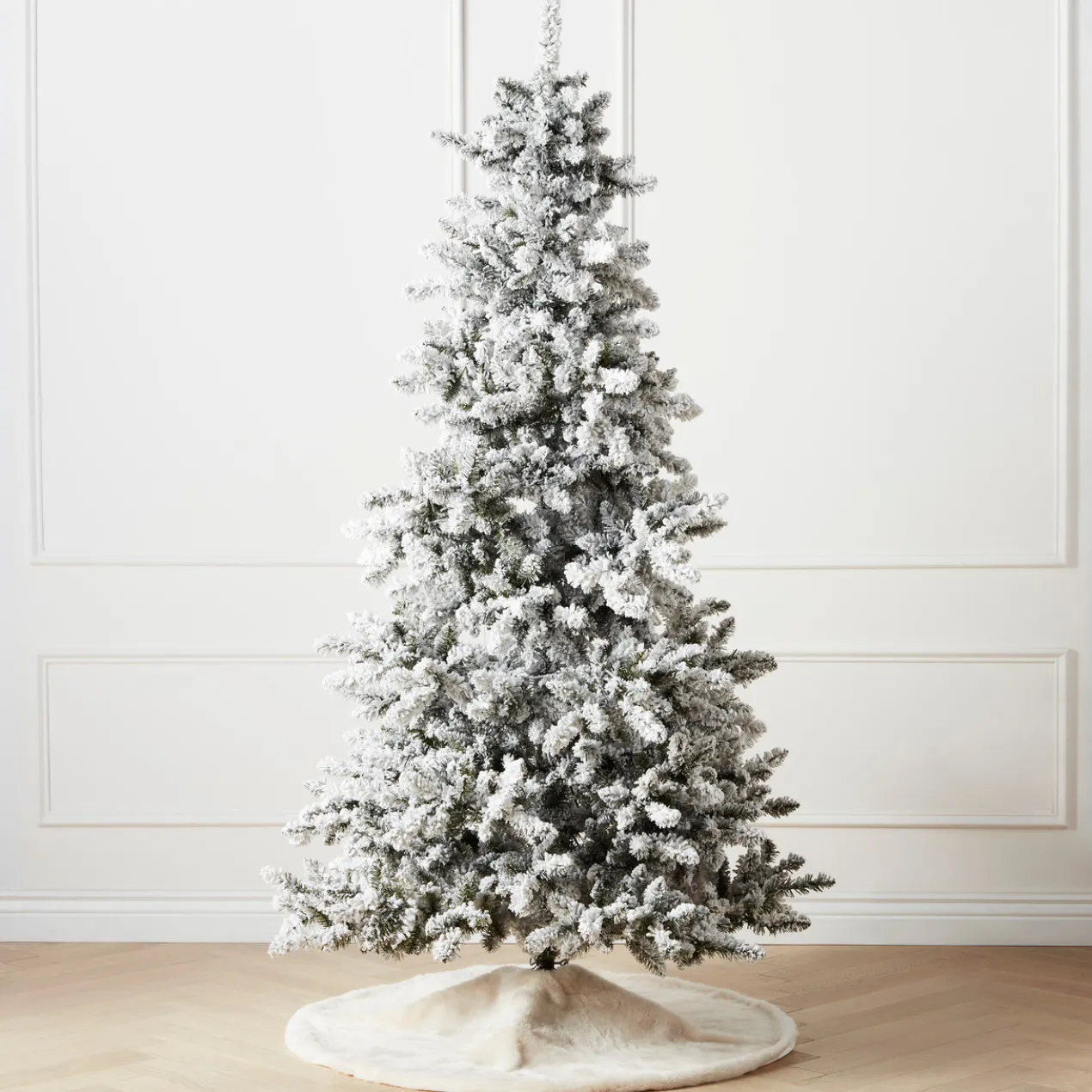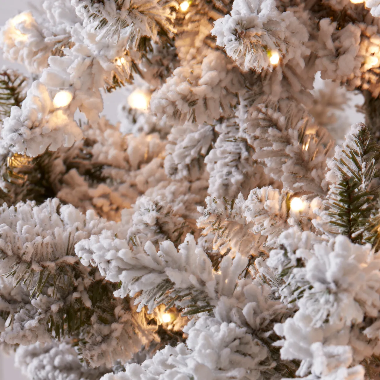 A festive addition to your holiday decor, this faux spruce tree comes pre-lit with warm white LED bulbs and is flocked for a snow-dusted, woodland look.