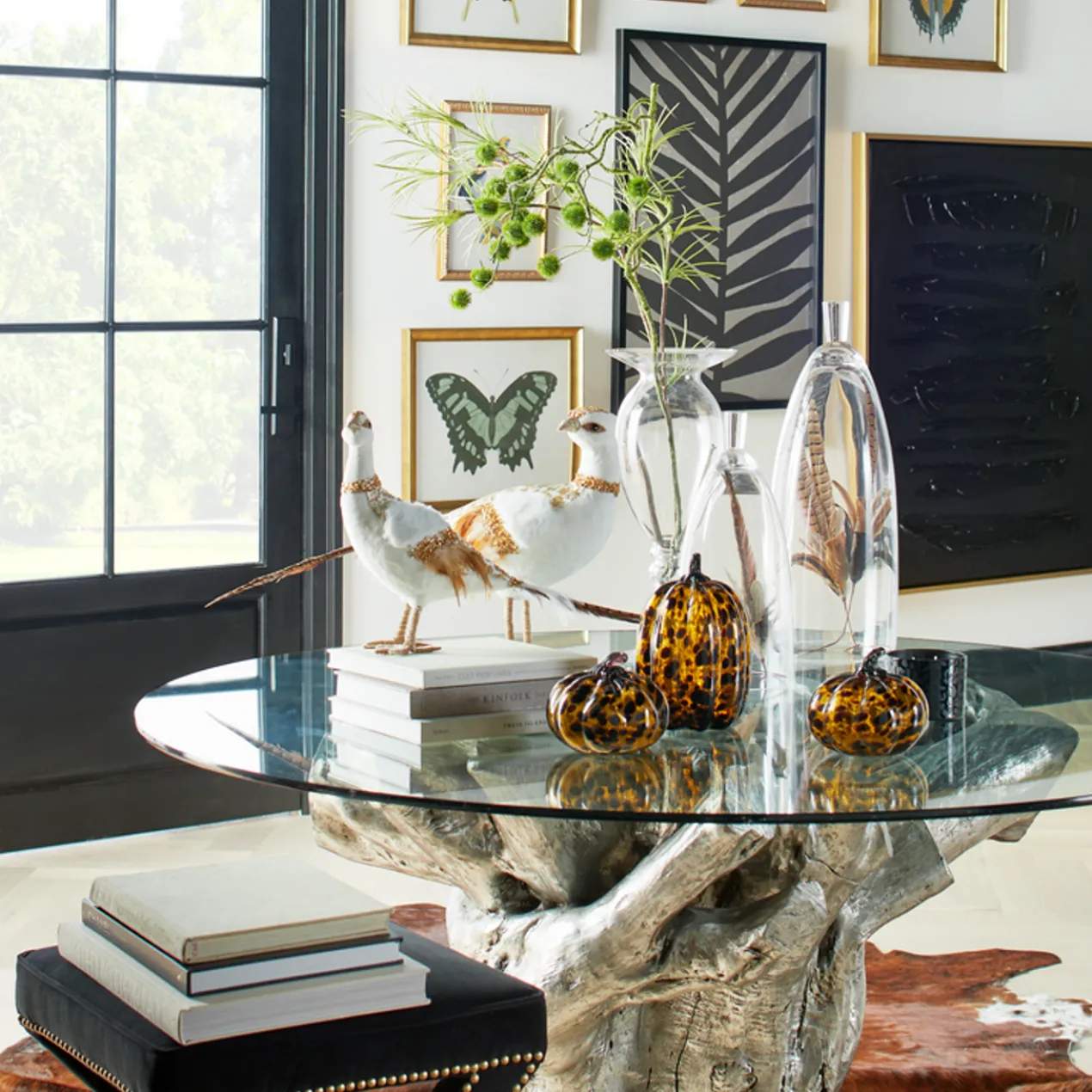 Invite natural looking elements into your home with luminescent Sequoia Dining Table. Carefully cast from the roots of an Acacia tree, our Sequoia Dining Table brings sculptural detailing to its surrounding décor. Moulded out of resin in a multi-step process, our Sequoia Dining Table is finished in silver leafing, giving the table base a subtle luster. A sixty inch round glass table top completes the table, allowing for easy viewing of the stunning organic display below.