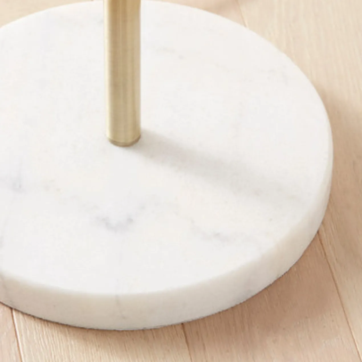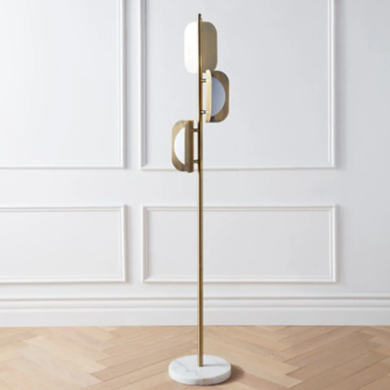 Defined by its sleek, soft-gold-finished frame and frosted acrylic shades, this floor lamp makes a chic statement in any space. A round marble base makes for a refined finishing touch.