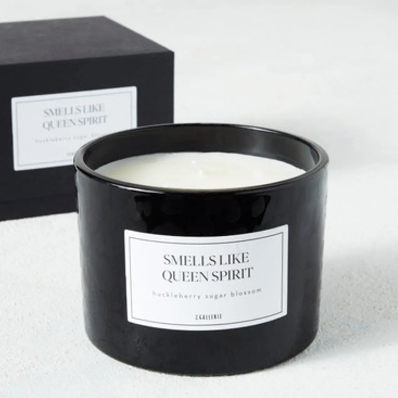 Presented in a black glass vessel with a tonal leopard print and sassy saying, this triple-wick candle features a fruity huckleberry sugar blossom scent and arrives in a handsome box, ready for gifting.