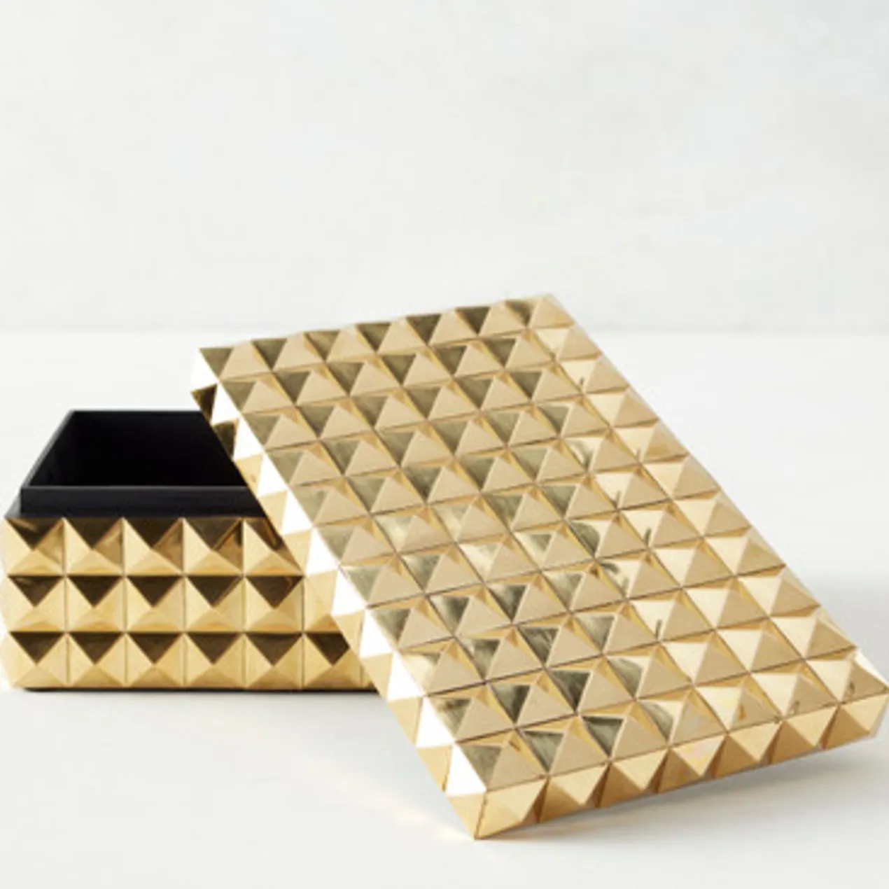 With its studded design and gold finish, this box makes a chic addition to a dresser, vanity, or console.