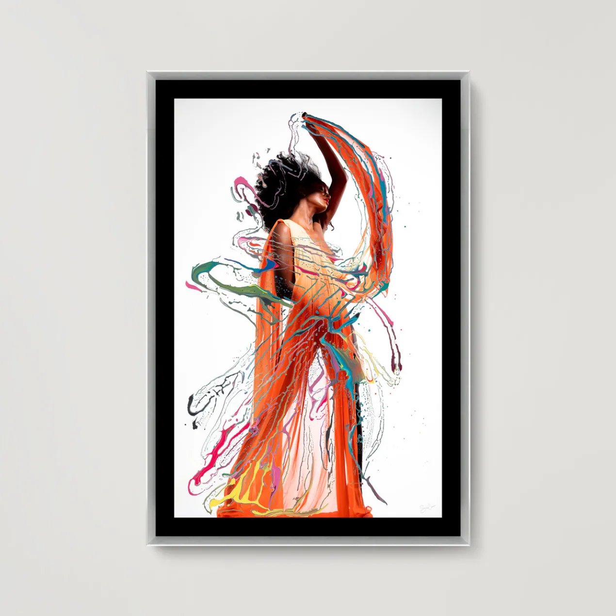 Image printed on artist paper floating on black matboard under acrylic glass encased in a silver frame.