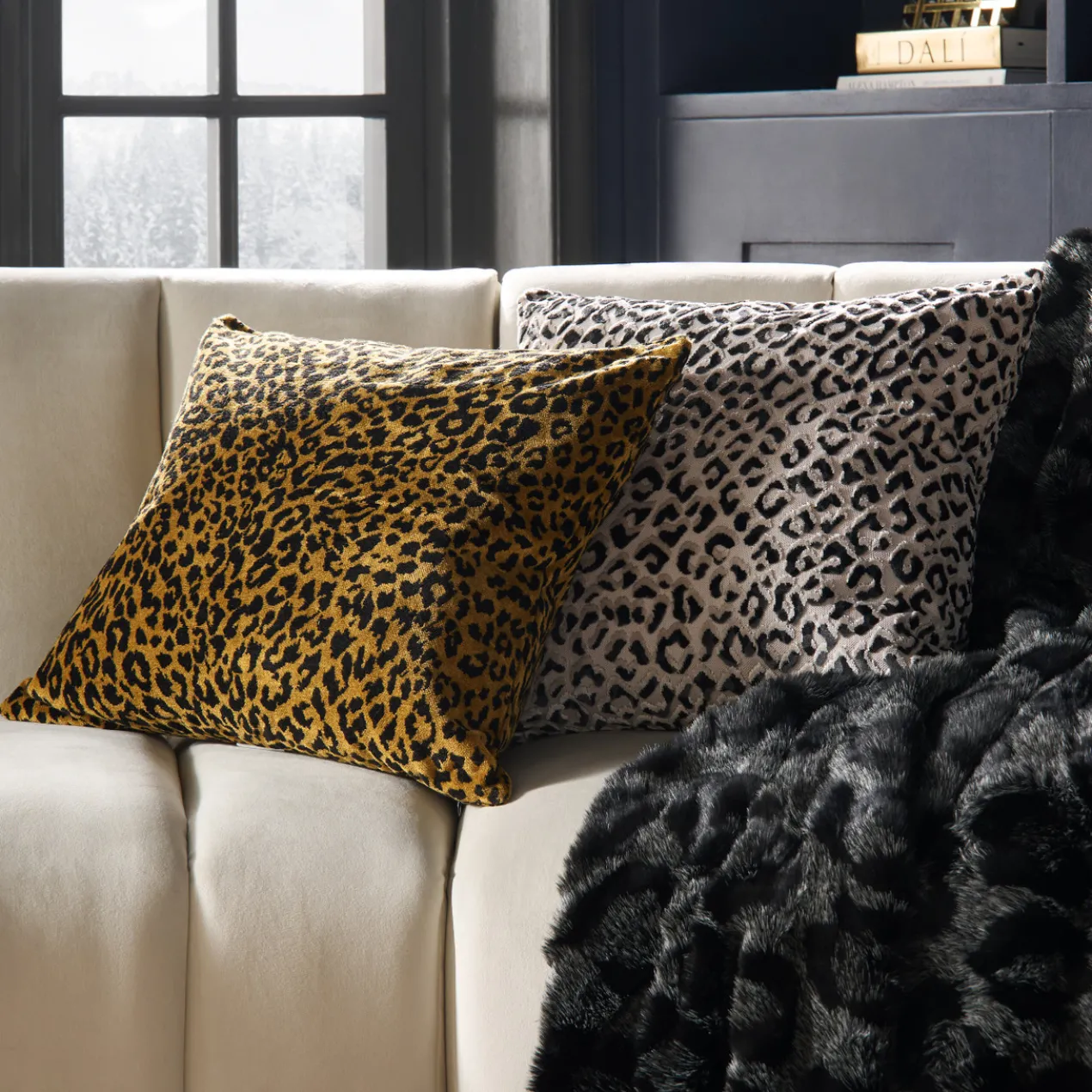 Woven on a jacquard loom in Belgium, this cut-velvet pillow features a high-low leopard print that combines three yarn colors for a striking tonal effect. Insert included.