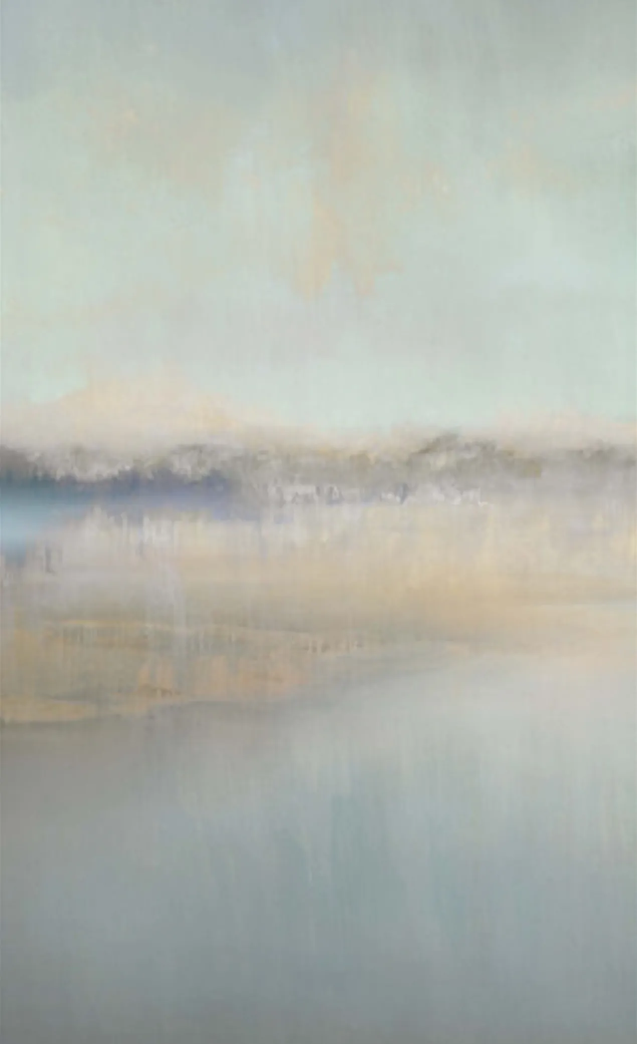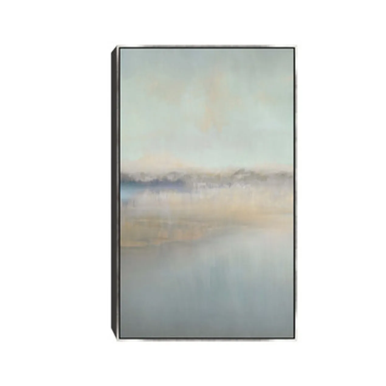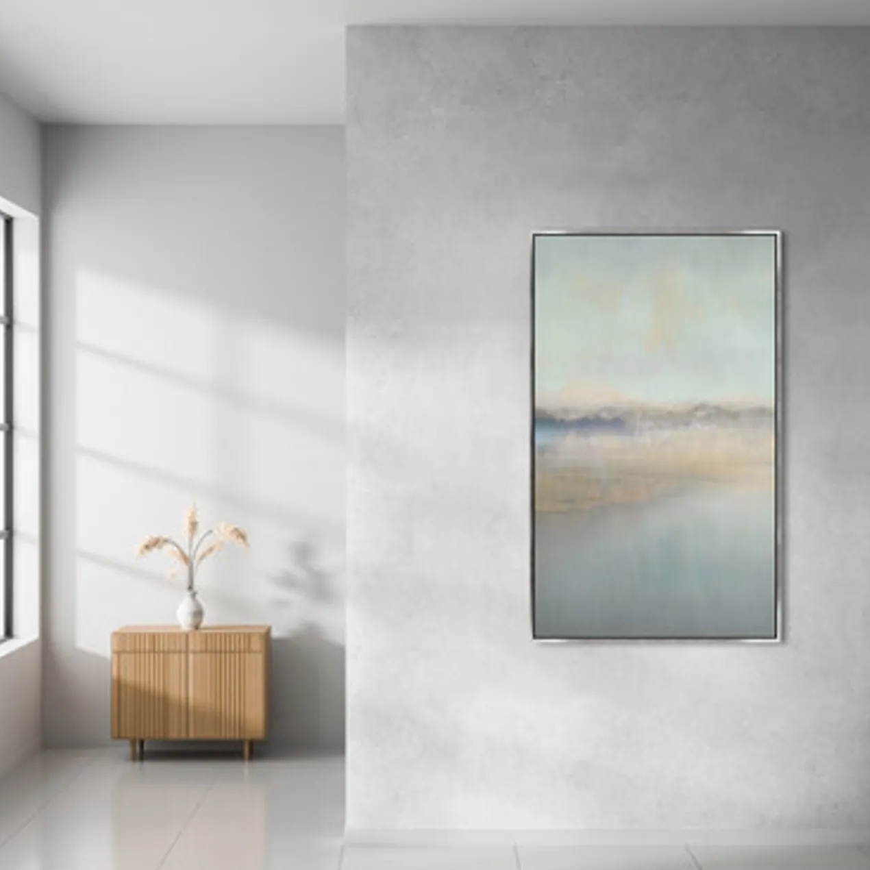 Gallery-wrapped canvas with hand-applied image brush gel finish. Set in a silver floater frame.
