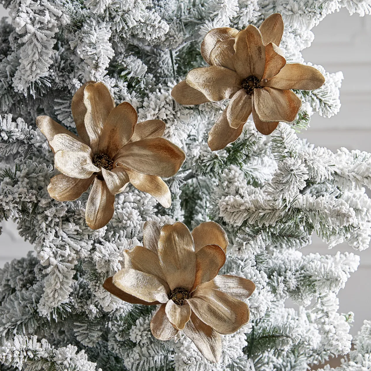This set of elegant champagne hued velvet magnolia makes a charming and unexpected accent for any holiday decor.